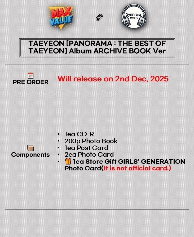 This ARCHIVE Ver. TAEYEON PANORAMA: THE BEST OF TAEYEON album is an officially distributed, brand-new, and factory-sealed release from SM Entertainment, made in Korea and fully counted toward major Korean charts like Hanteo, Circle, Synnara, and KBS Music Bank, so you can buy with confidence. You’ll receive a sealed CD-R album featuring a beautifully designed 220-page photo book, one postcard, two photo cards, and a bonus store gift Girls’ Generation photo card (non-official), making it a great collectible for fans.